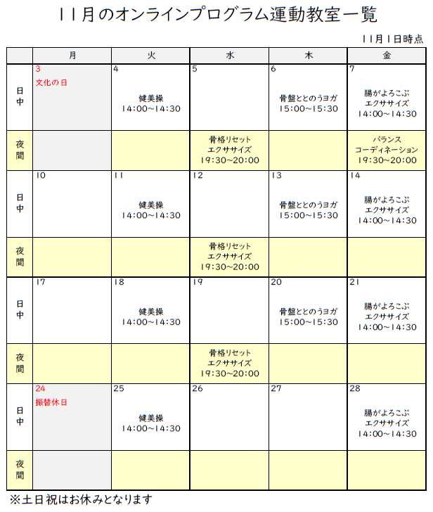 11月オンラインプログラム運動教室カレンダー 11月1日現在