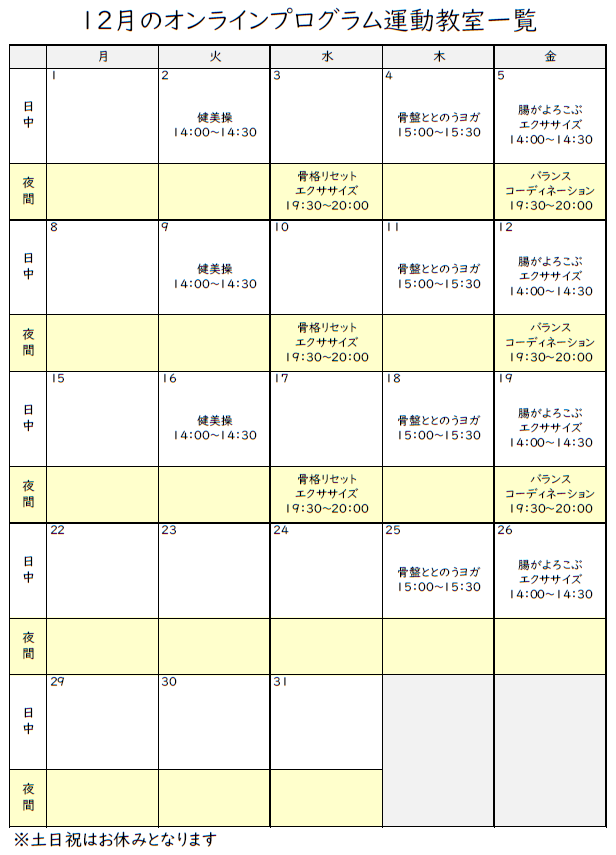 昨年度に引き続き、令和7年7月〜12月の期間に、体育文化会館にてZoom(WEB会議ツール)を利用した運動教室を開催いたします。全国で活躍しているバリエーションに富んだインストラクターのレッスンを受けることができるのはここだけ!