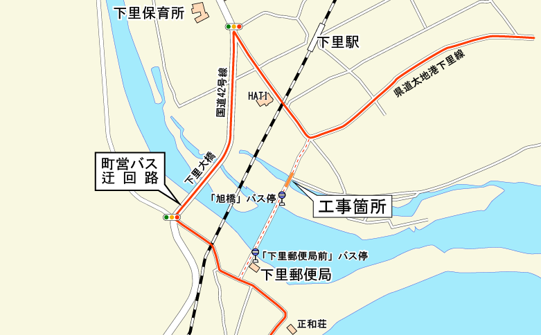 県道太地港下里線「間敷橋」付近における工事のため、町営バス下里線は下記期間において迂回路での運行となります。